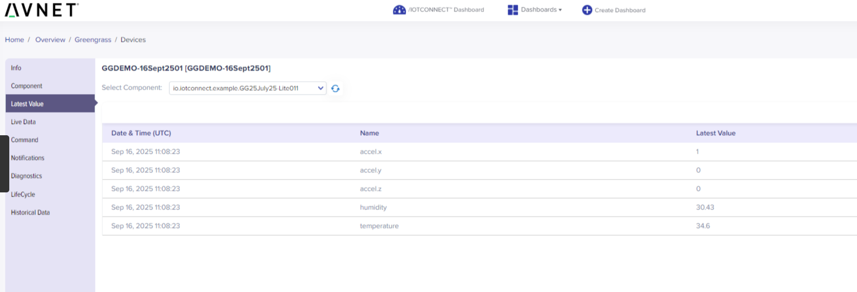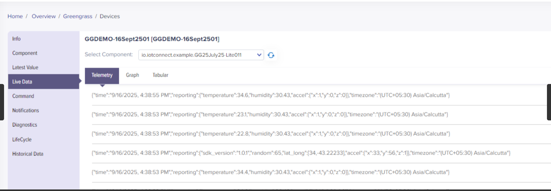 Manage devices describe the tools that /IOTCONNECT™ offers to manage a Greengrass device. You can view device information, get the latest values and live data, execute commands, shadow and notifications, check device health, and export historical data.